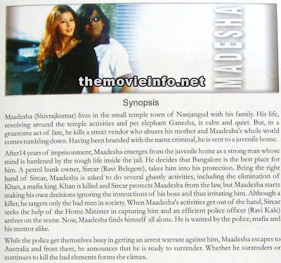 Maadesha is a typical Shivrajkumar movie in all possible ways.An out-and-out action thriller can be what we can say about this movie. Madesha tells the story of a poor village boy becoming an Underworld Don going through lots of risks in life. The movie have got some wonderful music, thanks to Melody King Mano Murthy.Fight scenes are really thrilling and movie is short partially in Australia too,making it an all round experience. Heroine as usual dont have much of a role,since the movie is hero centric.But neverthess Madesa is a cool action flick from "Namma Shivanna" for sure.